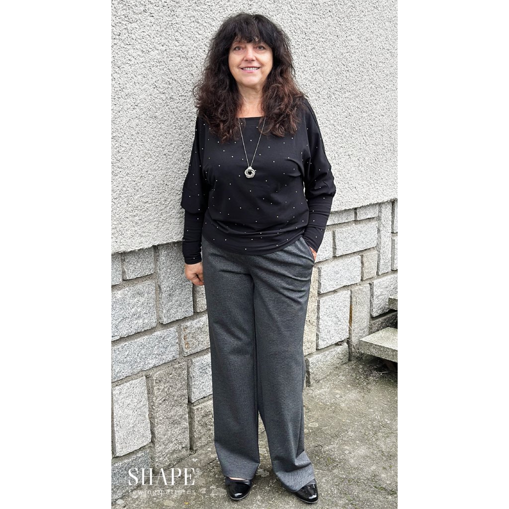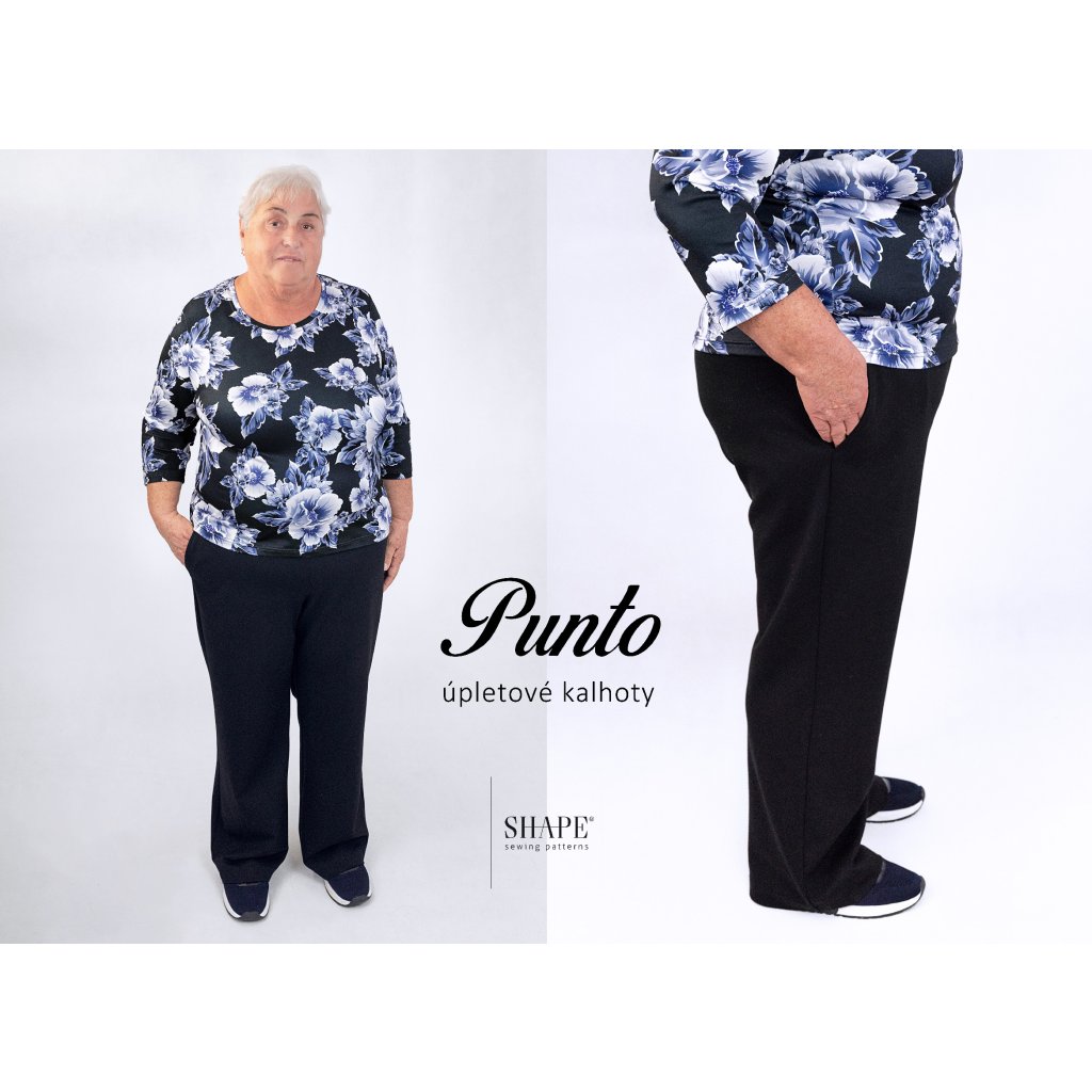 Přehledný oděvní střih na dámské úpletové kalhoty PUNTO. Velice příjemné kalhoty, ve kterých vydržíte celý den. Kalhoty mají pružný pas opatřený gumou š. 5 cm, samozřejmostí jsou dvě klínové kapsy. Šití je velice jednoduché:-).